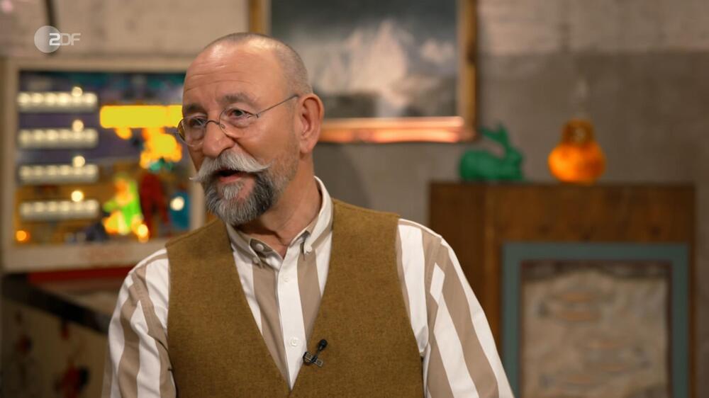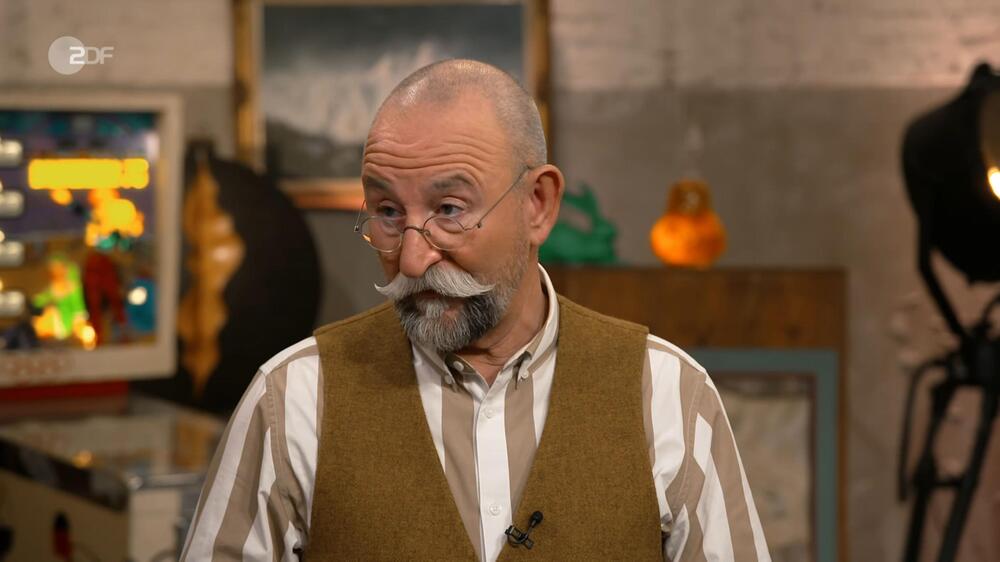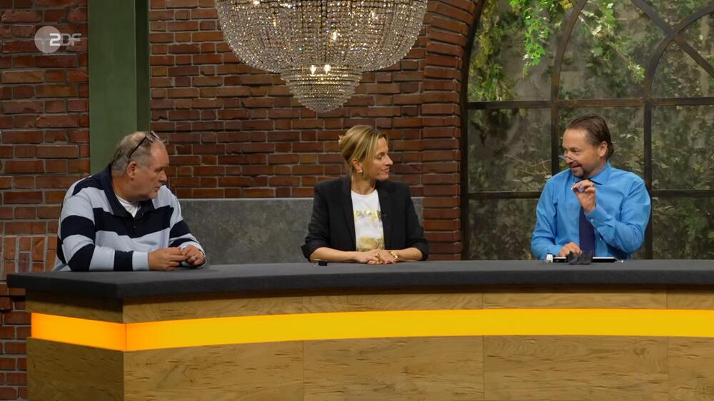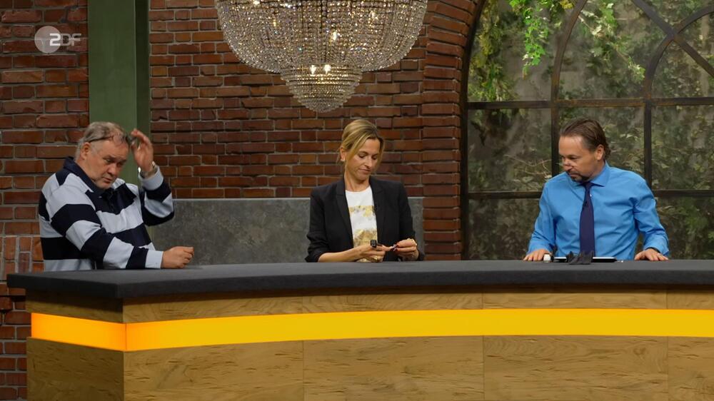 “Wir sagen ja profan ‘Kerzenleuchter'”, setzt Lichter an. Dann hält er einen der beiden mit ausgestrecktem Arm und fragt: “Und was ist das?” Expertin Heide Rezepa-Zabel kichert, weil sie sein Wortspiel erahnt: “Das ist ein Armleuchter.”