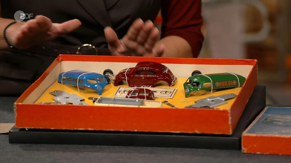 Ein VW-Baukasten von 1953/54 mit Originalkarton und in sehr gutem Zustand – die Reaktion des Moderators war zu erahnen. “Oh, Gott im Himmel, entschuldige, ich bin abgelenkt, das ist wunder …”, macht Lichter. Das Set sei besonders, weiß auch Expertin Annika Raßbach.